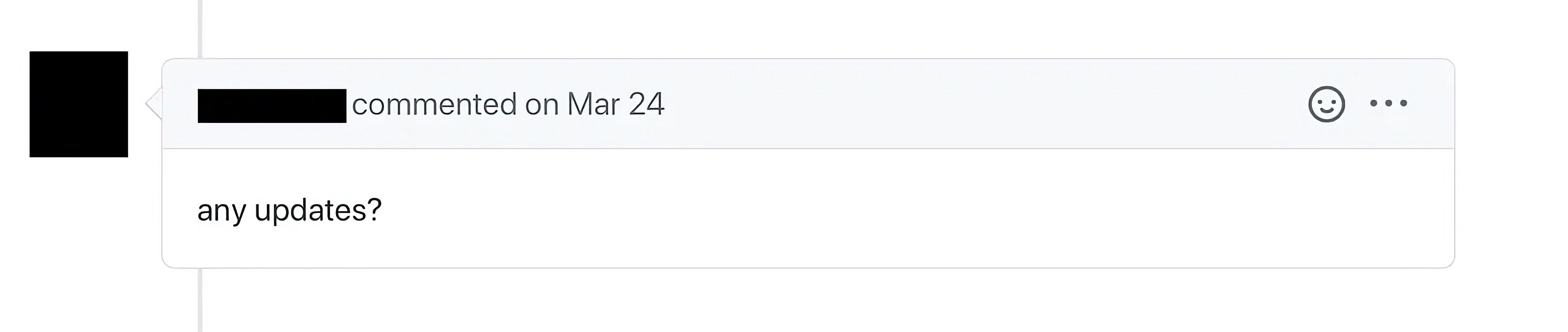 I frequently receive notifications on GitHub where someone comments, “Any updates?” on an old issue thread. The answer is always “No”. Updates are in the issue.